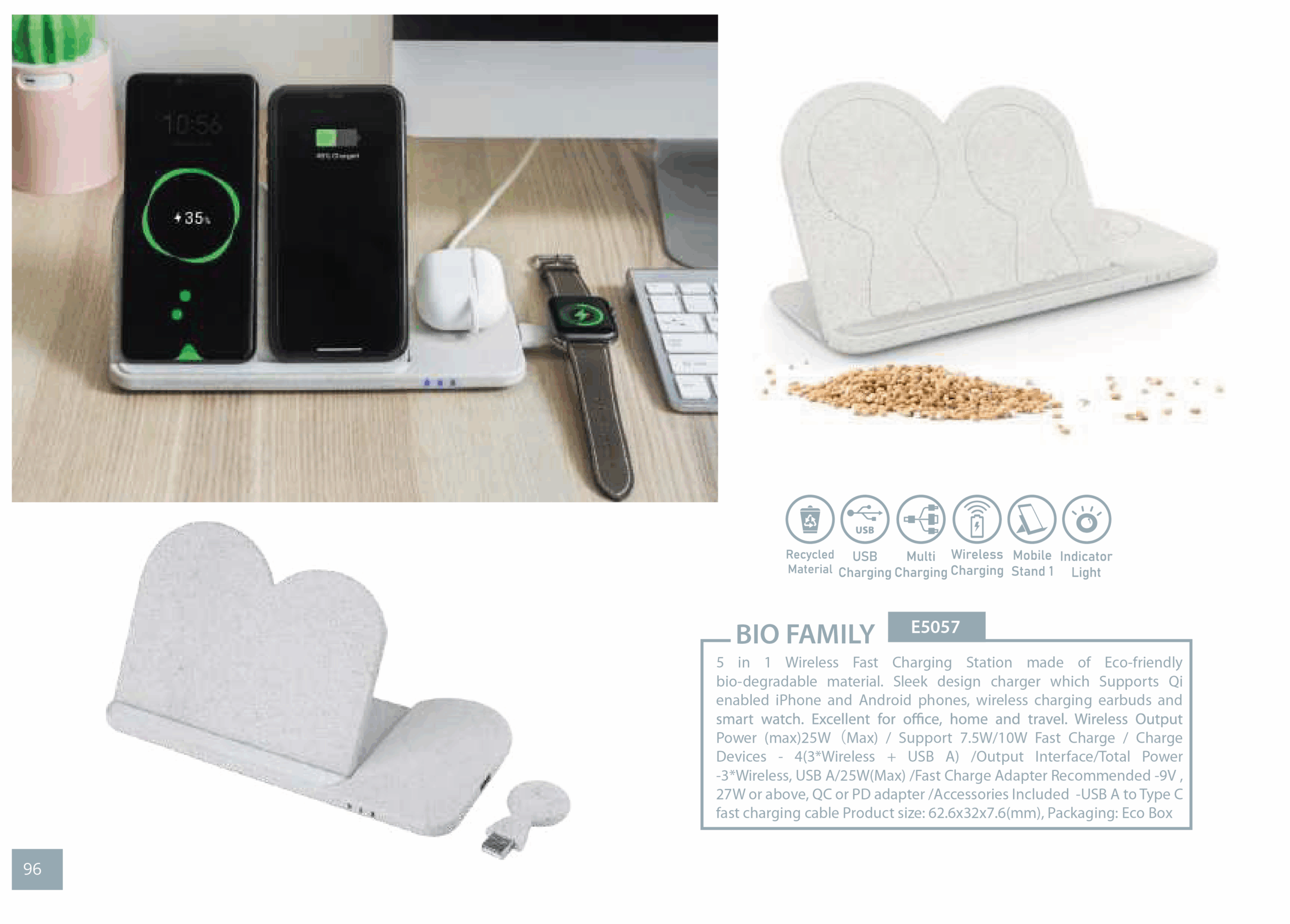 5 in 1 Wireless Fast Charging Station made of Eco-friendly bio-degradable material. Sleek design charger which Supports Qi enabled iPhone and Android phones, wireless charging earbuds and smart watch