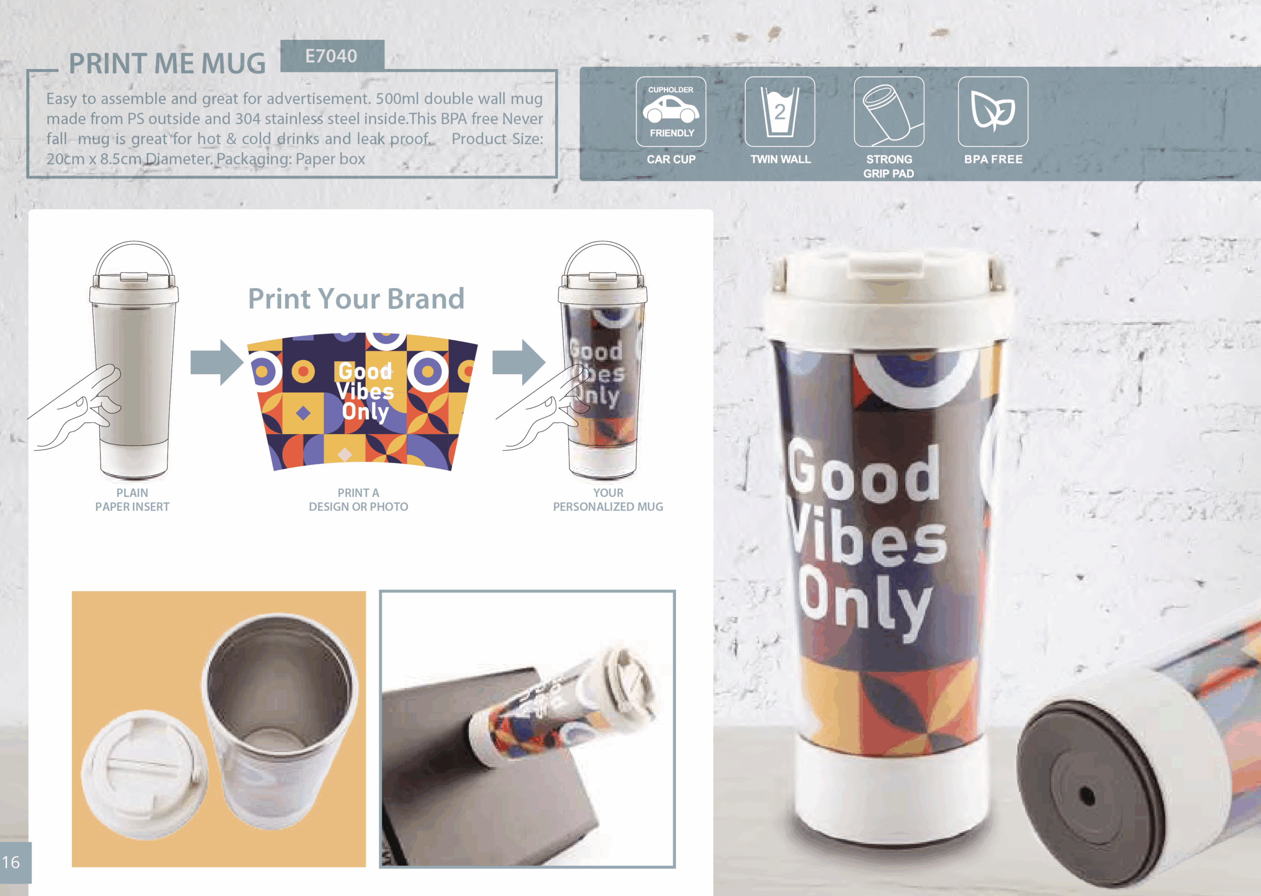 Easy to assemble and great for advertisement. 500ml double wall mug