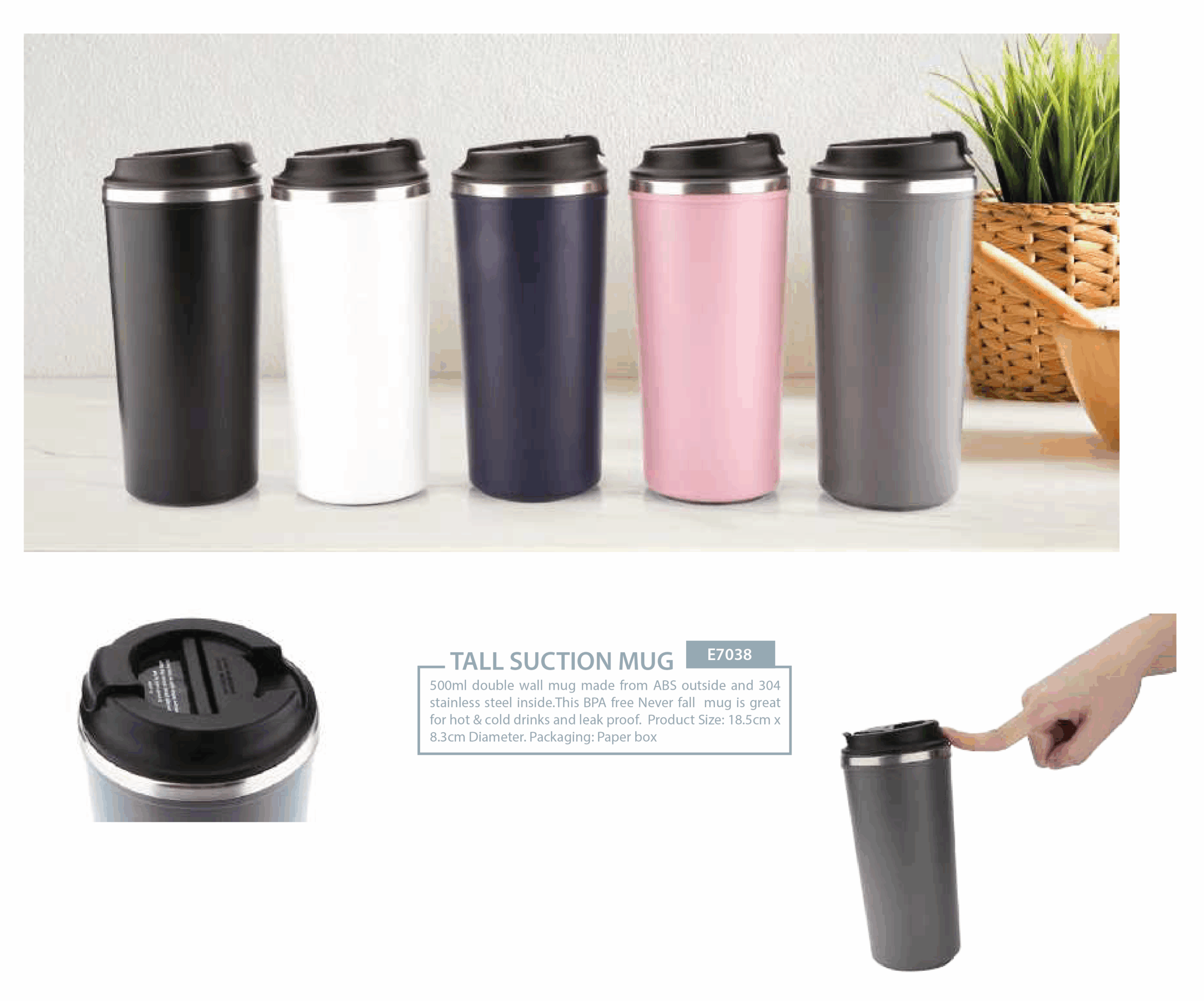 TALL SUCTION MUG E7038/20 500ml double wall mug made from ABS outside and 304 stainless steel inside. This BPA free Never fall mug is great for hot & cold drinks and leak proof. Product Size: 18.5cm x 8.3cm Diameter. Packaging: Paper box