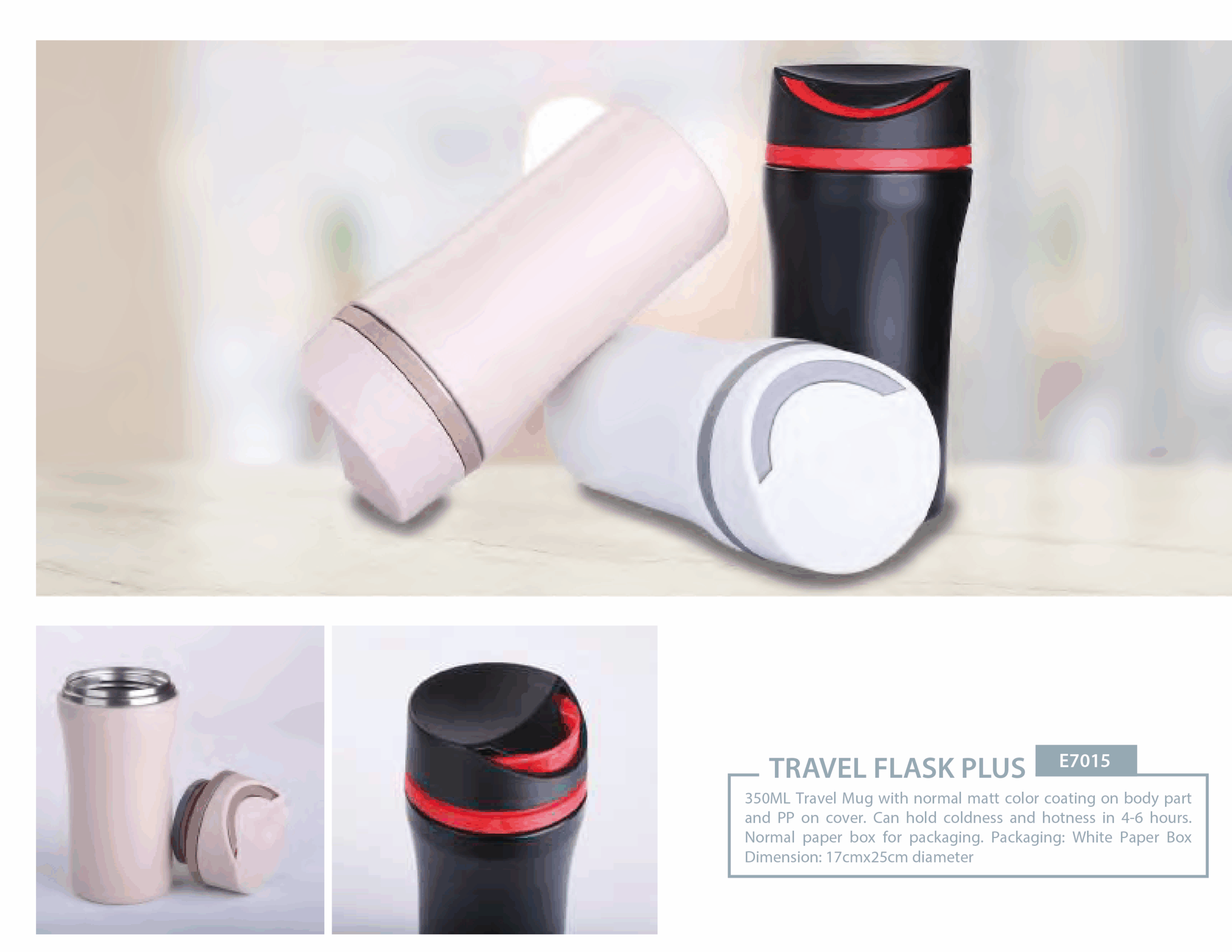 TRAVEL FLASK PLUS E7015/20 350ML Travel Mug with normal matt color coating on body part and PP on cover. Can hold coldness and hotness in 6-4 hours. Normal paper box for packaging. Packaging: White Paper Box Dimension: 17cmx25cm diameter